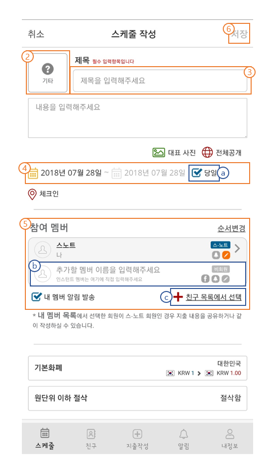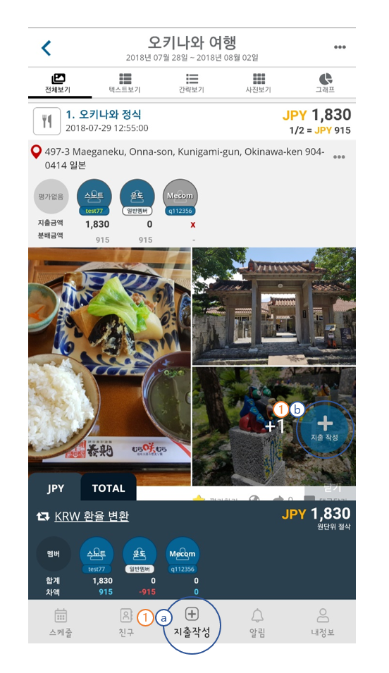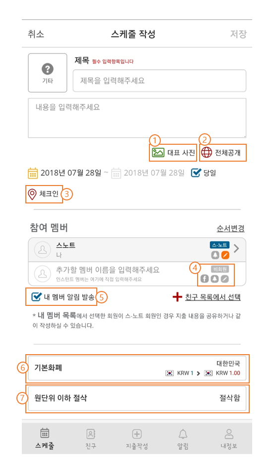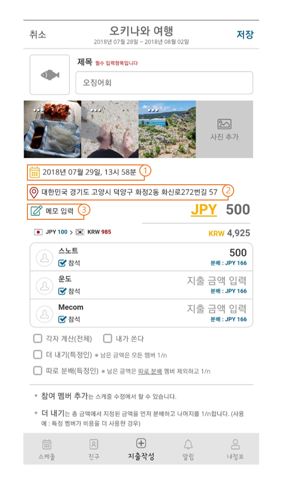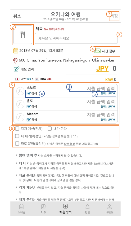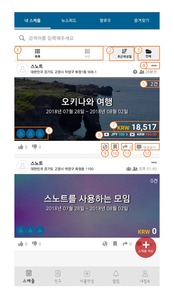 수정, 삭제, 숨기기, 신고하기 ⑤ 스케줄에 등록된 지출 작성 건 수 ⑥ 스케줄에 참여한 멤버 리스트 ⑦ 스케줄 총 지출 금액 ⑧ 스케줄에 설정된 기본환율 정보 ⑨ 스케줄에 등록된 지출 장소 지도 표시