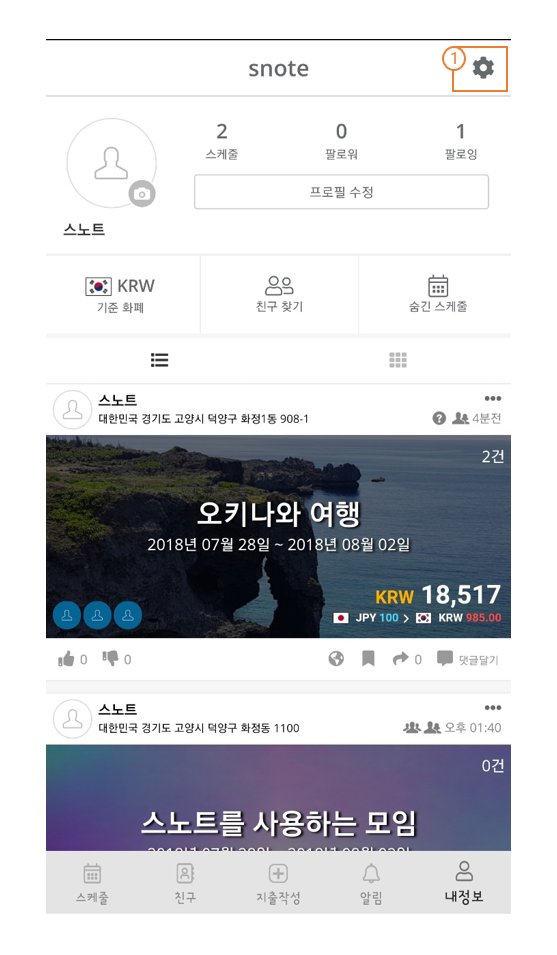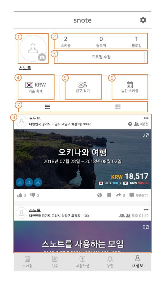 소개글 등록 및 수정 ④ 기준화폐 변경 ⑤ 친구찾기