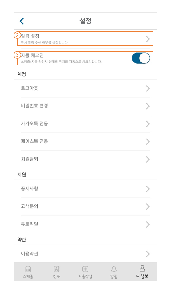 내정보 > 설정 > 자동 체크인 항목에서 ON/OFF로 변경